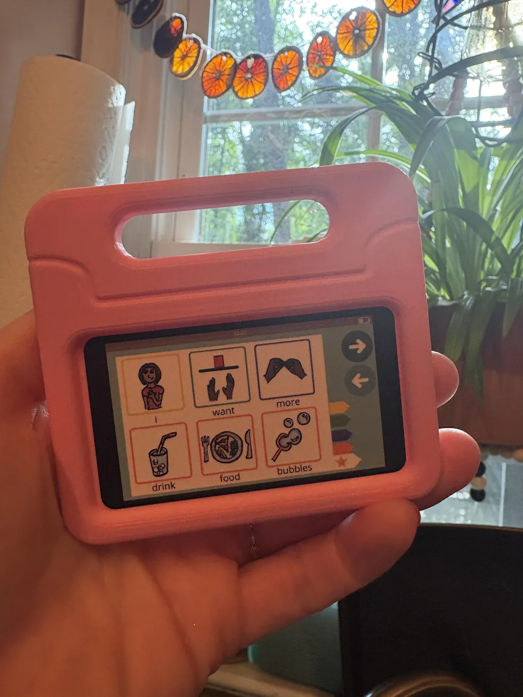 This doll-sized tablet was designed with doll-play in mind: featuring "milk," "food," and "potty" nouns, to aid in pretend play with dolls!